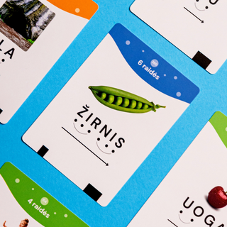 • 161 dvipusė skaitymo kortelė (kortelės suskirstytos spalvomis pagal raidžių kiekį žodyje);